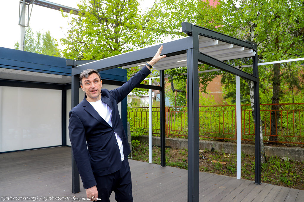 А это уже Александр Афоничев, основатель компании CORPSUN, он мне, собственно, и показал весь свой завод. И ещё один плюс от меня им в карму. Ведь всегда интересно общаться с теми, кто сам создавал бизнес, как там говорят «собаку съел» на этом деле. Друзья, смотрите - вкусный инсайт успел подснять, это тёплая веранда нового поколения. Настоящая бомба, лето-то у нас и не такое долгое, а если и есть, то не всегда жарой своей радует. Здесь использован специальный материал, который равносилен толщине стены в 500 мм. И влага не попадёт, и конденсата не будет. Можно даже в зимний период использовать, а летом интегрировать в летнюю площадку. Эта конструкция называется "Открой своё небо", скоро её окончательно протестируют, получат все необходимые патенты и будут запускать в серийное производство. Несколько лет ушло на эту разработку. Почувствовали вкус новых прибылей, уважаемые рестораторы, можете не благодарить, главное, чтоб у вас всё было на отлично.
