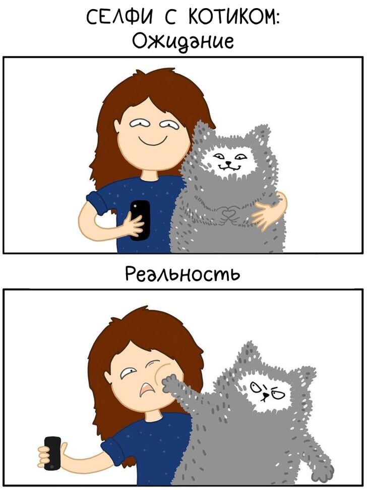 Многие люди любят котиков. Кто-то заводит одного, кто-то двух, а у автора этих комиксов аж 4-ре котика! Лена Соломонова занимается разработкой индивидуальных сувениров, наклеек и логотипов, а еще ведет свой блог Лакшери-Котакшери. Девушка часто выпускает комиксы, герои которых, ее собственные домашние животные. Все идеи для иллюстраций она берет из повседневной жизни со своими котиками. Почему-то кошки не любят фотографироваться. Стоит только включить камеру, как они сразу же убегают. У кого такие же котики? Еще одна иллюстрация на эту тему. Я заметила, что когда занимаешься своими делами, то животным тоже становится интересно, что там делает их хозяин. Наверно так и надо их фоткать, просто делаешь вид, что ты занят, а потом щелк и кадр готов! Котики знают все! Они видят нас такими, какими не увидит больше никто. Все наши секреты, как мы ведем себя, когда никого нет рядом. В общем, если бы вдруг они смогли разговаривать, им было бы что рассказать. Интересное время настало бы. А ведь