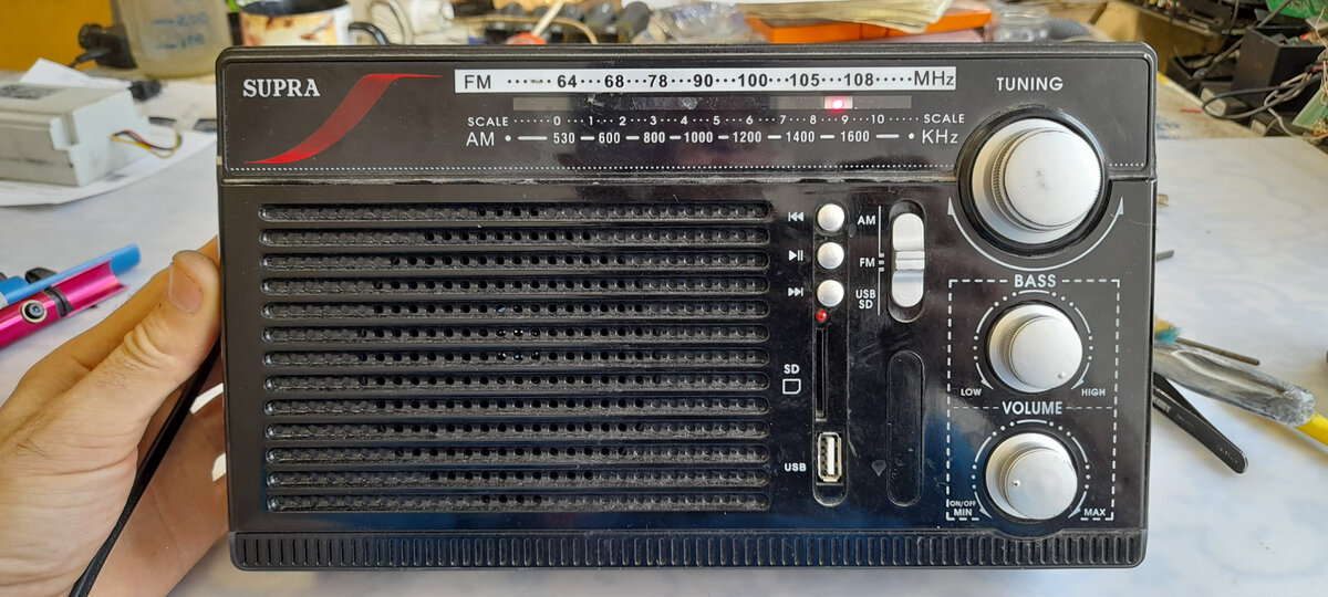 Всем здравствуйте! Сегодня у нас на ремонте радиоприёмник Supra с интересным дефектом. При включении режима радио независимо от диапазона сначала нет приёма станций, через какое-то время может начать ловить. Спустя какое-то время станция может "уплыть" или на её место становится другая. В обще какая-то чехарда... Вот такой приёмничек. А вот что у него внутри. Стандартный "набор" :) "Шикарный" блок питания :) Ну и сама плата. Сначала решил померить не плавает-ли напряжение питания на стабилизаторе. При уходе напряжения возможен сдвиг частоты. Но тут напряжение 3,32 вольта стоят как вкопанные! Также решил померить напряжение на резисторе настройки частоты. Но и здесь, на всех выводах и между собой и относительно минуса, напряжение порядка 1,3-2,5 в зависимости от настроенной станции, напряжение в момент ухода станций стоит стабильно... Интересный дефект... Сначала подумал на микросхему. Здесь в тюнере применяется микросхема bk1198 схема включения ниже. Это конечно не наша схема но