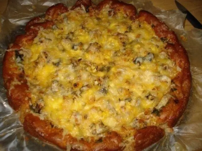 Ингредиенты: кефир, сырое яйцо, мука, сода ½ ч.л, Начинка :, рыбные консервы, отварные яйца, любая зелень, сыр Способ приготовления: Начинаем с приготовления теста. Смешиваем все ингредиенты и выливаем в смазанную маслом форму. Рыбу отделяем от масла и разминаем вилкой. Добавляем мелко нарезанные яйца и зелень. Сыр натираем на мелкой терке. Начинку выкладываем в форму, стараясь оставить свободную тонкую полоску теста у бортика. Форму ставим в разогретую духовку минут на 20. Достаем почти готовый пирог и посыпаем его сыром, потом вновь отправляем в духовку на 5 минут.