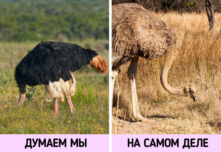 Помимо этого, столкнувшись с опасностью, страусы наклоняют головы к земле в попытках слиться с окружающей средой. Но в песок их не зарывают.