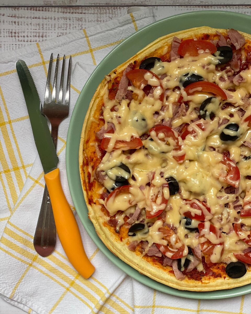 #пицца, #пицца_на_сковородке #скорая_пицца Жарко, лишний раз духовку включать не хочется. Тесто: Все составляющие выложить и перемешать венчиком до однородности (в той последовательности, что по списку). Тесто получается густоватое. Если хотите более грубый корж, замешивайте 1,5 порции. На горячую смазанную сковороду маслом выложить тесто, равномерно распределить. Свернуть огонь меньше среднего, накрыть крышкой и жарить 2-3 минуты. Перевернуть лепешку, сразу смазать соусом (у меня протушены с итальянскими травами томаты), Выложить начинку (у меня колбаса, маслины, помидоры, творог), Накрыть крышкой и держать, пока творог не расплавится. Это очень быстро и невероятно вкусно! #лето_без_духовки