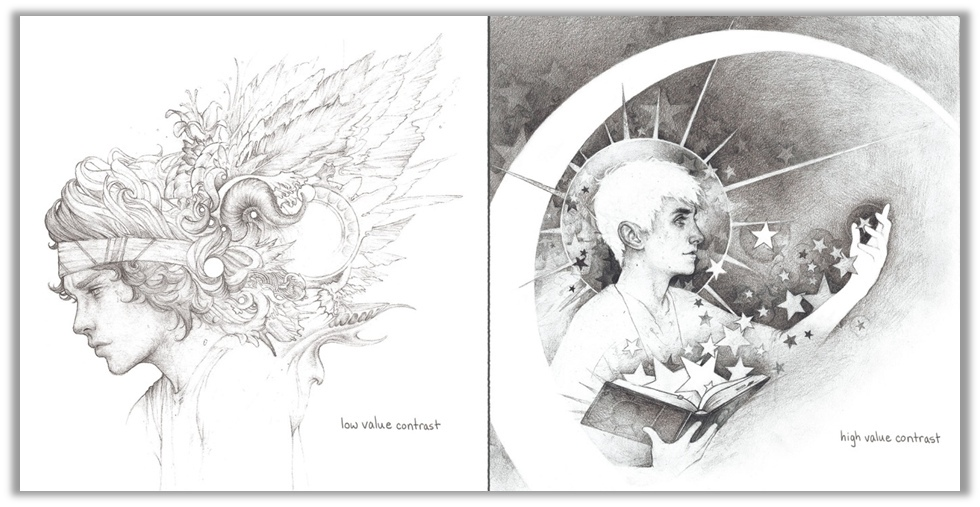 «Вы можете заметить, что первый скетч с мягким и низким контрастом позволяет продолжительно разглядывать изображение. При этом в рисунке нет конкретной точки фокуса», – объясняет фон Рюден. «В то время как высококонтрастный скетч справа максимально притягивает внимание к самым светлым участкам на контрасте с самыми темными».