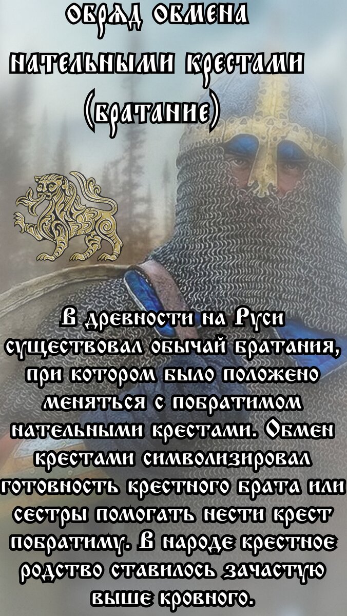 Включение нового воина в коллектив дружинников также сопровождалось определенным ритуальным действием. О нем мы можем судить по ритуалу “братания” нового богатыря, принимаемого в богатырскую дружину: “Золотыми крестами поменялиси, Обнялись они поцеловалиси, Святогор-богатырь да будет больший брат, Илья Муромец да будет меньший брат, Хлеба-соли тут оно откушали, Белой лебеди порушали”. “Он побраталсэ крестами золотыми тут, Называет их крестовыма все брателками”. Здесь мы видим обмен крестами, определенную словесную формулу и ритуальную трапезу. Как и у народов Западной и Центральной Европы, посвящение молодых воинов на Руси проводили старшие заслуженные дружинники. Это, в частности, видно из былин. Так, например, Илью Муромца посвящают в богатыри калики перехожие, сами являвшиеся богатырями, а также богатырь старшего поколения Святогор. Последнее обстоятельство указывает на важную роль при этом наставника: в таком качестве выступает в былинах Святогор. Проведение