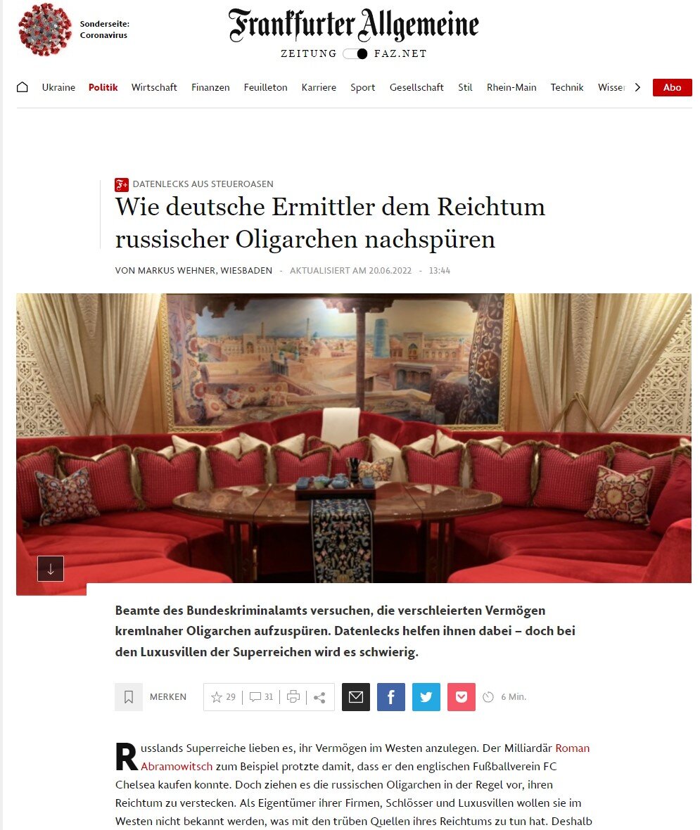 Немецкая пресса опубликовала статью о том, как следователи Федерального ведомства уголовной полиции Германии (BKA) находят теневое состояние российских олигархов в Европе. Зачастую это утечка данных самих олигархов, но когда речь заходит о дорогих виллах, то в поисках возникают затруднения. Богачи России любят хранит свои богатства на Западе, как, к примеру миллиардер Роман Абрамович, который показывал всем, что может позволить себе приобрести футбольную команду Челси. Все же как правило «западные» олигархи, ведь их состояние именно на Западе, а не в России, предпочитают прятать свои богатства от всеобщих глаз. Кто именно владелец той или иной фирмы, замка и виллы сверхбогачи предпочитают скрывать от Запада, переписав активы на родственников или подставных лиц. Так же создаются фирмы — «почтовые ящики» в так называемой «налоговой гавани». В связи с СВО России на Украине, Европа ввела санкции только против тех олигархов, кто тесно связан с Путиным, теперь наиважнейшая цель, найти все и