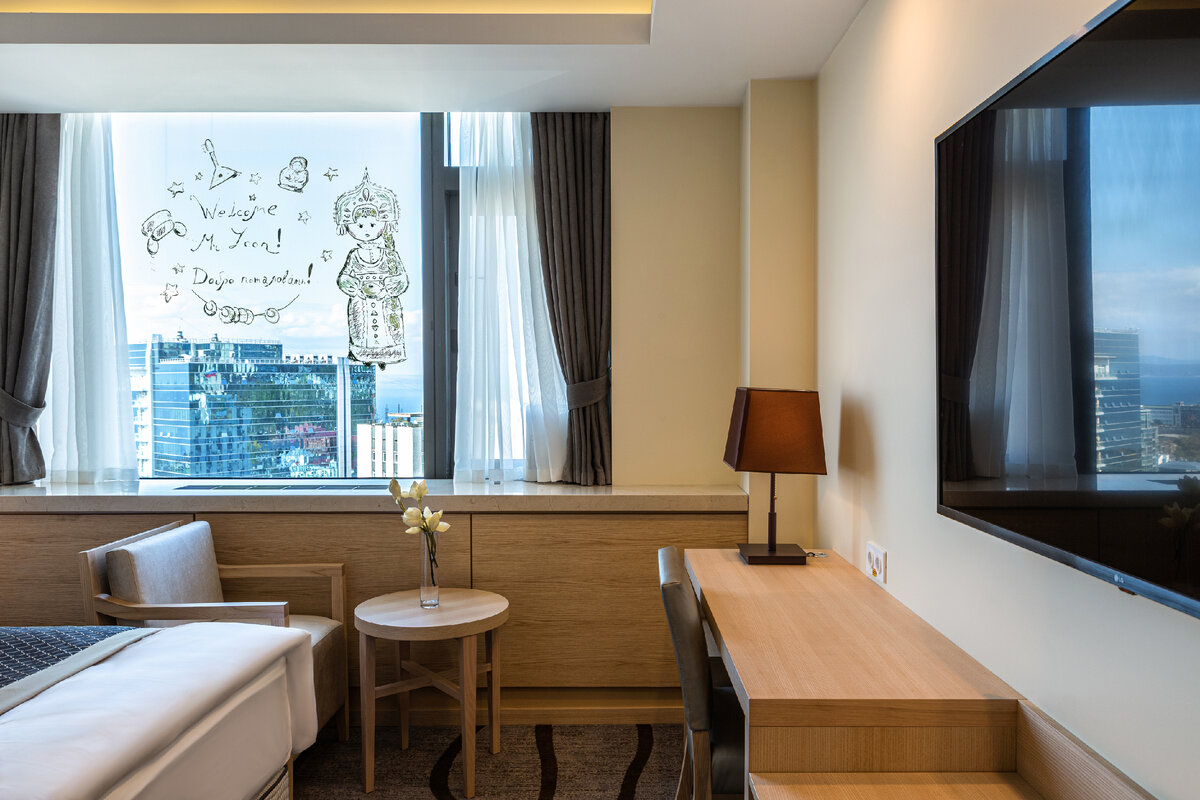 Всем путешественникам со стажем известно, что большинство отелей приветствуют своих гостей небольшими комплиментами в номере. Это может быть фирменная коробочка с десертом от шеф-повара, тарелка с сезонными фруктами или бутылка шампанского в ведерке со льдом. ЛОТТЕ ОТЕЛЬ ВЛАДИВОСТОК предоставляет все перечисленное для проживающих, но у нас также есть и особая услуга о которой пойдет речь сегодня! Каждый, кто хоть раз снимал номер в отеле, прекрасно понимает, как важно, чтобы вид из окна открывал не стену соседнего здания, а приятный морской пейзаж или местную достопримечательность. Если на окне красуется вдохновляющая надпись, то гость получает не только эстетическое наслаждение, но и заряд бодрости на целый день. По предварительному запросу гостя сотрудник ЛОТТЕ ОТЕЛЯ ВЛАДИВОСТОК украсит окно номера тематическим скетчем и приветствием! Для иностранных туристов мы предлагаем рисунки с русским колоритом, а для прибывших из других городов России – рисунки, посвященные главным символам Вл