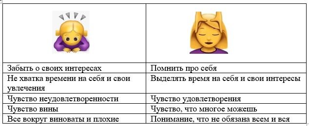 В интернете сейчас можно найти множество советов по улучшению жизни, по саморазвитию. Как сделать первый шаг к светлому будущему. С чего начать, список медитаций, упражнений, дневников и прочих штуковин. И здесь у меня для вас есть 2 новости. Как говорится, хорошая и плохая. Плохая - всё это не работает. Хорошая - вы можете сделать так, чтобы заработало. Для этого важно принять следующее: Чтобы хоть чуточку развернуть вашу жизнь в яркокрасочное русло, запомните, что ___________________________________________________________________ в приоритете только ВАШЕ счастье! ___________________________________________________________________ Сейчас у кого-то могло зашевелиться чувство возмущения. Что это эгоизм, так нельзя, не хорошо. Друзья, эгоизм еще никому не навредил, при условии, что он здравый. Посмотрите как может сложиться ваше здесь и сейчас при разных условиях: режим всем должна & здоровый эгоизм Знаете почему ваши желания, интересы, потребности важны и должн