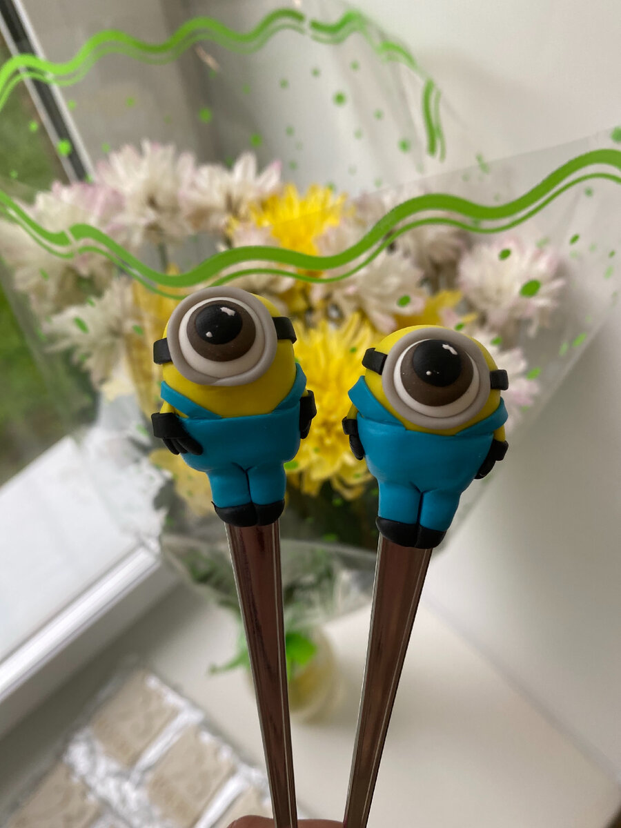 Всем доброго времени суток! Сегодня я вам расскажу и покажу пошаговый мастер-класс по лепке миньона. Материал для работы я выбрала полимерную глину. Полимерная глина (пластик) - это материал предназначенный для лепки небольших скульптур и статуэток, декора посуды и других твёрдых поверхностей. В зависимости от производителя рекомендованная температура нагревания 120-130 С. Данный декор в виде миньона выполняется на столовом приборе (чайная ложка) Цветовая гамма используемого материала: желтый (лимонный), синий, коричневый, чёрный, белый. Для отблеска на глазу я использовала акриловый контур белого цвета. для работы нам понадобятся: Ход работы: Перед тем как приступить к лепке, нужно размять глину до мягкого состояния. Если глина твёрдая, то ее можно размягчить в горячей воде. Либо, использовать специальное средство для размягчения. Я иногда использую Sculpey. Работу выполнять нужно в перчатках, что бы не оставить следы отпечатков пальцев на готовом изделии. Если не работаете в п