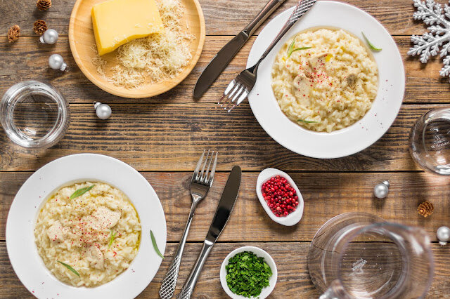 Это ризотто состоит из очень простых продуктов, очень легкое в приготовлении и, конечно, вкусное. Хорошая идея для семейного ужина. Понадобятся (для 4-х порций): 1 лавровый лист ½ ч. л. черного перца горошком 2 филе куриной грудки по 200 г каждое 1-1,2 л куриного бульона 1ст. л. оливкового масла 50 г сливочного масла 1 луковица 300 г риса арборио 100 мл сухого белого вина 100 г пармезана натертого (отложите немного для подачи) 2-3 веточки петрушки морская соль свежемолотый черный перец для подачи (не обязательно): масло с трюфелем листья тархуна розовый перец В среднюю кастрюлю влейте 750 мл воды, добавьте лавровый лист и черный перец горошком. Доведите до кипения, положите в кастрюлю куриные грудки, накройте крышкой и варите на слабом огне 15-20 минут. Снимите с огня и дайте слегка остыть, затем достаньте курицу из кастрюли и нарежьте полосками. Влейте куриный бульон в большую кастрюлю и доведите до кипения. Убавьте огонь до очень слабого, накройте крышкой и держите бульон подогретым