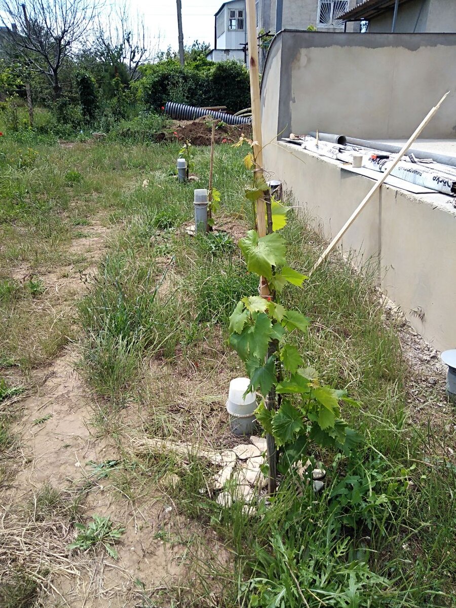 Как-то у нас в этом сезоне благоустройство участка быстрее продвигается. Или мне так кажется? Оно у нас уже почти три года идёт, это благоустройство. Тянутся и тянутся дела, и нет им конца. Целыми днями в работе, и всё как-то - то там не сделано, то тут не доделано. А сейчас, словно перейден какой-то рубеж. Количество работы начало переходить в качество картинки. Тайга и сад подрастают, приобретают свой характер и уже легче понимать, в какую сторону надо творить. Виноградник стал похож на виноградник, а не на три куста винограда, висящие на вбитых мною в землю палках. Просто хозяин, наконец, дома. Нашему винограду всего три года. И мы за эти три года уже умудрились свои несколько кустов пересадить с места на место. Вот он наш бедолага в прошлом году. Сорт Мускат Голодрыга (на первом плане) и Ландыш. Наверное, все наслышаны, а уж крымчане то точно помнят, какие ливни у нас были в прошлом году. Нет худа без добра. Наш виноград вдруг начал расти буквально на глазах. А я впервые испугалась