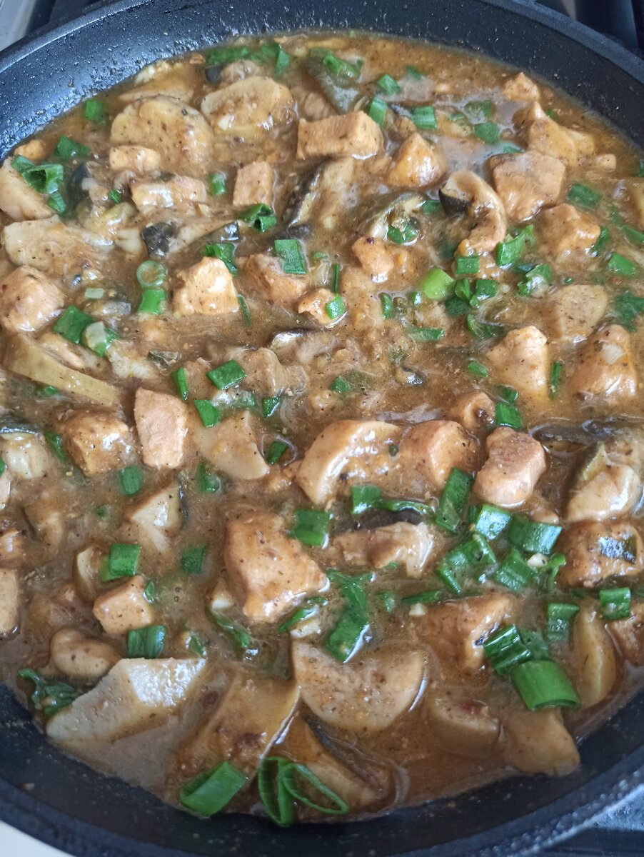 Начался грибной сезон и само собой, грех не сходить в лес и не побаловать себя и своих близких, ароматным деликатесом из белых грибочков. Любители грибов меня поймут, ведь сказать что это вкусно, ничего не сказать!! Для приготовления нам понадобятся, белые грибы 700грамм, куриная грудка 400гр, одна луковица, специи( в моём случае хмели-сунели) можно любые другие и чеснок 3зубчика. Грибы чистим, режем и промываем под проточной водой Далее нарезаем куриную грудку и ставим разогревать сковородку. Затем наливаем растительное масло и отправляем на сковородку заранее порезаный репчатый лук( у меня не оказалось репчатого я порезала немного зелёного) Почти сразу отправляем туда же грудку и готовим под крышкой около пяти минут Затем выкладываем в сковородку грибы, убавляем огонь до среднего, накрываем крышкой и ждём когда грибы дадут сок Перемешиваем, снова накрываем крышкой и готовим 20-25 минут. После чего солим,добавляем специи( можно просто посолить тоже будет очень вкусно) Перемешиваем