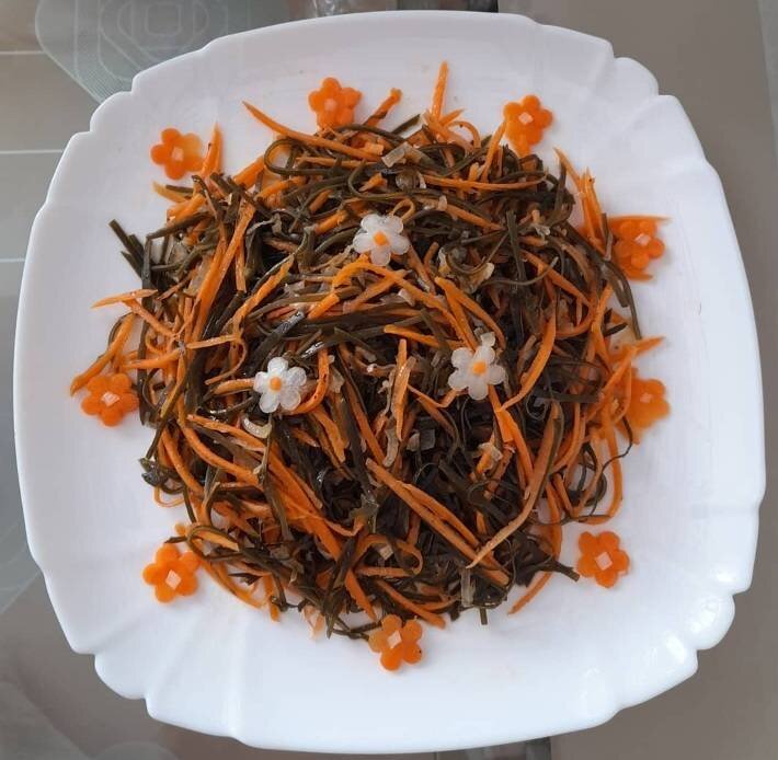 Салат с морской капусты очень полезный продукт для нашего организма. Рецепт приготовления из сухой морской капусты и моркови. Получается вкусно, обязательно попробуйте. #морскаякапуста #салат #полезно #еда #рецепты #готовимдома Если этого количества много, то уменьшайте количество ингредиентов. Ингредиенты: Сухая морская капуста , Морковь , Соль , Растительное масло , Уксус , Лук репчатый , Чеснок по желанию. , Специи для корейской моркови , Молотый чёрный перец Способ приготовления: Капусту положить в глубокую ёмкость, залить водой (желательно фильтрованной, чистой) Капуста как губка впитывает все,важно чтобы не впитала в себя ничего плохого. Оставить на 1-2 часа, за это время она увеличится в объёме, станет скользкой. Переложить в дуршлаг и тщательно промыть под проточной водой. Она должна быть не скользкой. Руками отжать с неё воду, добавить морковь натертую на терке для корейской моркови. В сковороду налить масло, хорошо разогреть, лук нарезанный полукольцами обжарить до лёгкого зо