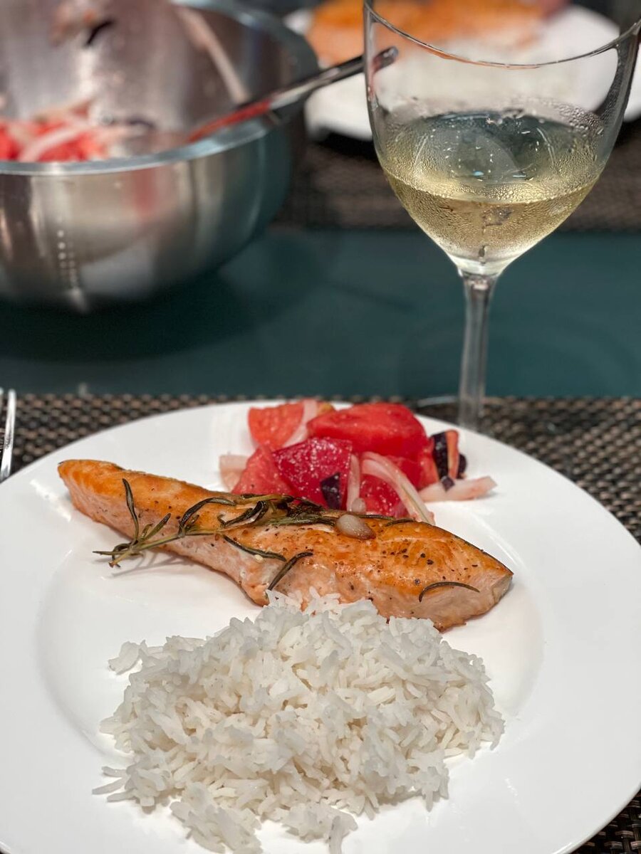 Делается очень быстро и просто: 1. Филе лосося моем чистим , солим/перчим , раскладываем на доску, обкладываемым свежими ветками розмарина и дольками чеснока . 2. Разогреваем сковородку с оливковым маслом и ставим параллельно рис жасмин в пароварку. 3. На хорошо прогретую сковородку выкладываем лосось вместе с розмарином и чесночными дольками, порезанными вдоль пополам. На хорошем огне обжариваем до корочки со всех сторон. 4. Пока рыба жарится , а рис парится , режем крупными кусками садовые домашние помидоры, белый сладкий лук , красный базилик, солим/перчим и заливаем салат подсолнечными маслом с рынка ручного отжима ( оно пахнет бесподобно). 😍 Вуаля! Превкуснейший и очень полезный ужин готов! Всем приятного аппетита
