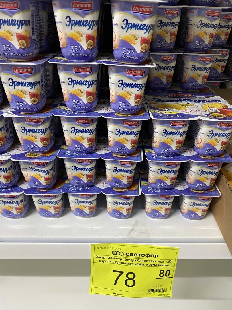 Товар "Светофора"-йогурт Эрмигурт Экстра Слив., м.д.ж. 7,5 % с тропическими фруктами/с клуб. и земляникой, 4*100 грамм за 78,80 р. Вкусно !