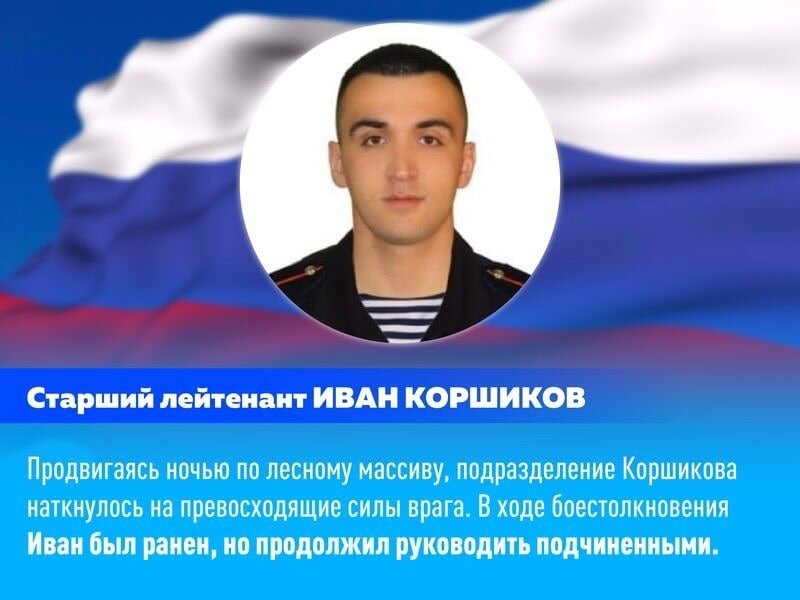 Старший лейтенант Иван Коршиков с группой морских пехотинцев в освобожденном районе обезвредили большой отряд диверсантов. У радикалов был целый грузовик иностранного оружия и боеприпасов. Офицер лично уничтожил минометный расчет и более 15 националистов. Несмотря на ранение, командир продолжал бой до полного разгрома врага.