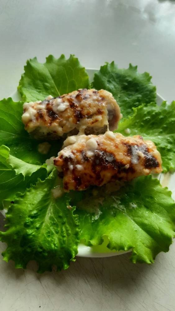 Мясные рулеты с творожным сыром и зеленью, под соусом бешамель
