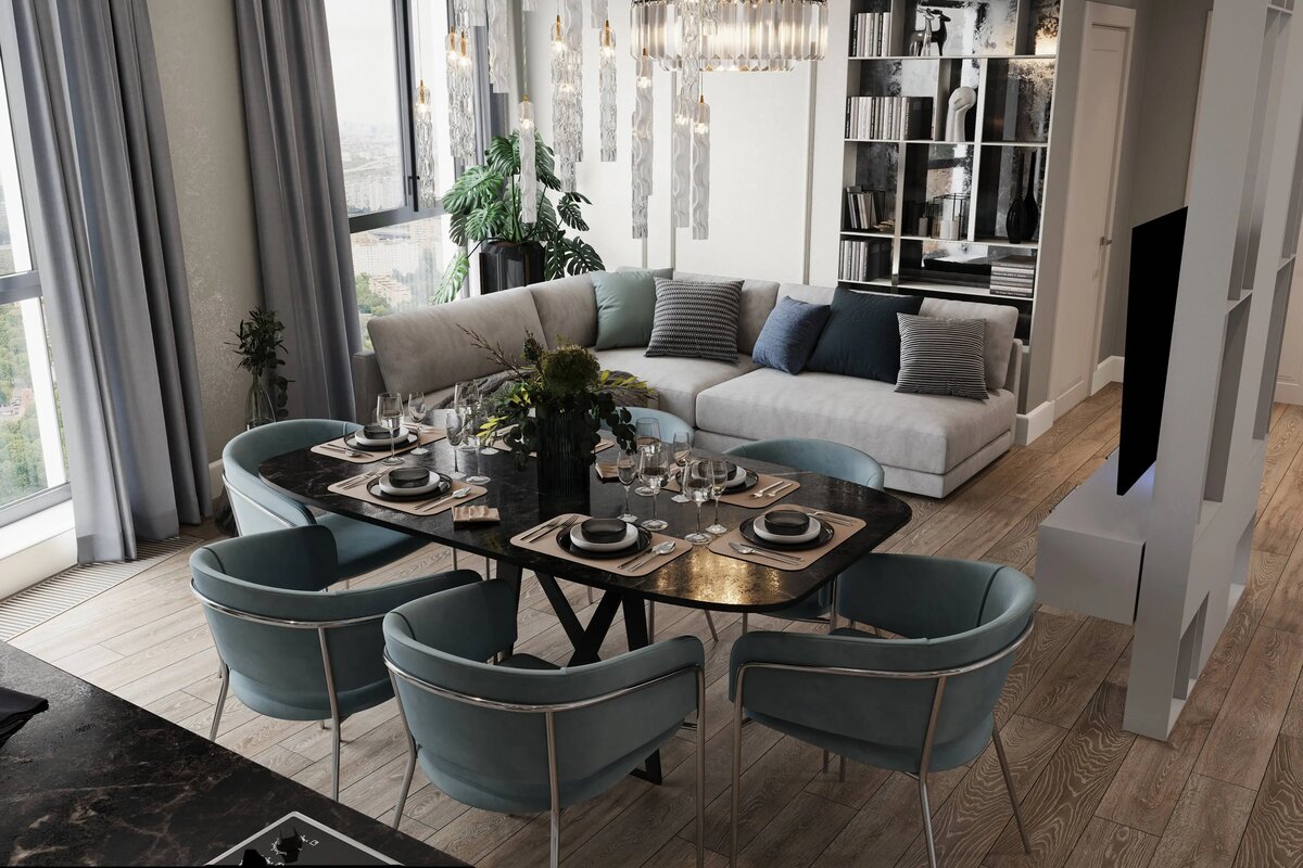 Для этой просторной квартиры дизайнеры предложили холодную цветовую гамму, которая оптимальна для благородной неоклассики, и сложные фактуры. Центром студийной гостиной стала обеденная группа, а фоном для нее — эксклюзивный фартук из слэбов природного оникса.