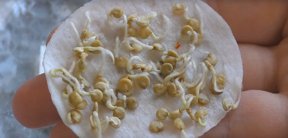 Думаю, многим пригодится мой метод, ведь скоро начнется подготовка к садово-огородному сезону: все будут высаживать рассаду дома, проращивать семена и т.д. Я привыкла проращивать семена в ватных дисках: для меня этот метод наиболее удобен. Сейчас я расскажу вам, как я проращиваю семена. Для этого возьмите два ватных диска и смочите их водой комнатной температуры. Если у вас много семян, возьмите немного больше: 4 или 6, 8 - в общем, столько, сколько вам нужно. Поместите семена между двумя ватными дисками, стараясь не прижимать их слишком плотно друг к другу. Поместите влажные ватные диски с семенами в контейнер и накройте его крышкой (закрывать ее не нужно, просто накройте, чтобы впустить воздух). Можно также накрыть пленкой или пакетом (сделайте несколько проколов, чтобы семена не задохнулись). Буквально через 1,5-2 дня появляются хорошие ростки. Если корни немного прорастут в вате, ничего страшного. Высаживайте растения непосредственно с помощью куска ваты, не приседая, иначе можно