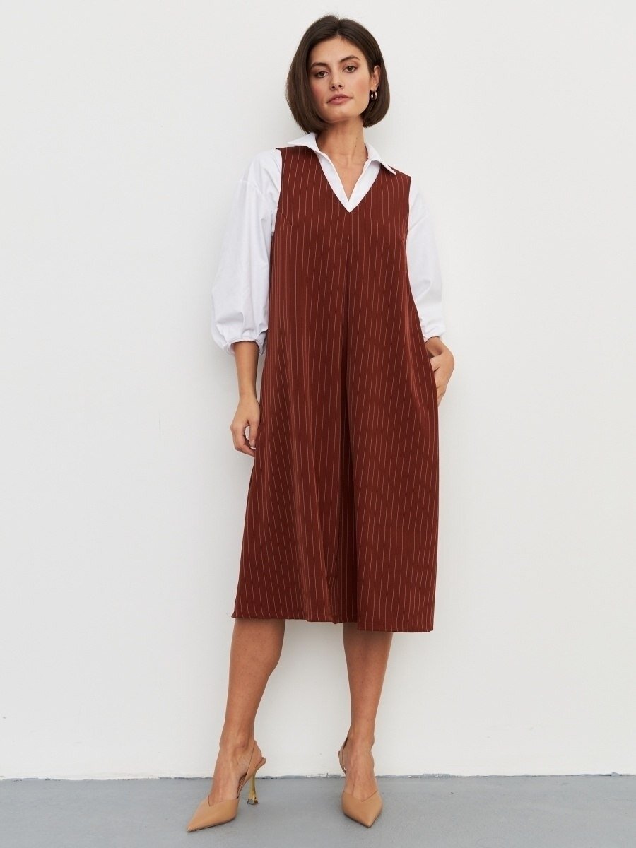 - Начнем с офисных сарафанов. Такая одежда подходит и для лета, и для зимы. Носить офисный сарафан необходимо с рубашкой или водолазкой. Универсальный выбор – сарафан силуэта трапеция с V-образным вырезом. Такая модель прекрасно будет смотреться и на стройных, и на полных женщинах любого возраста. Модель сшита из ткани красивого красно-коричневого оттенка в тонкую вертикальную полоску.