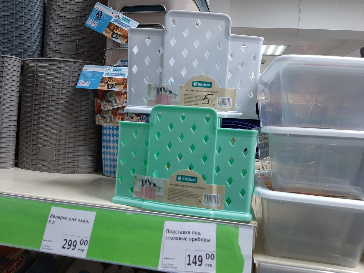 Добрый день! Немного задержалась с походом в Fix-Price, а зря, там привезли СТОЛЬКО всего, что глаза разбегаются, а руки сами хватают НОВИНКИ с полок) Приглашаю посмотреть всё в моём обзоре! Чем больше лайков соберёт материал, тем чаще будут выходить обзоры из этого разнопланового магазинчика! Начнём с подставки под столовые приборы в двух цветах. Несомненно, её плюсами является то, что есть вентиляция, которая поможет с испарением влаги внутри, а также, как можно увидеть, отверстия выполнены довольно аккуратно. В принципе, считаю, что 149 рублей - более-менее адекватная цена, учитывая вместимость подставки. Главное, чтобы она была устойчивая. Рядом стояли ещё контейнеры по 85 рублей за штуку (с картой Фикс-Прайс) и новые, интересные банки в сдержанном стильном дизайне в плиточку) Не посмотрела состав, но, учитывая цену, вероятно, они жестяные (или тоже пластиковые?). Крышка кажется деревянной, но не факт) На главном стенде целая россыпь товаров всех мастей! Тут и корзины для