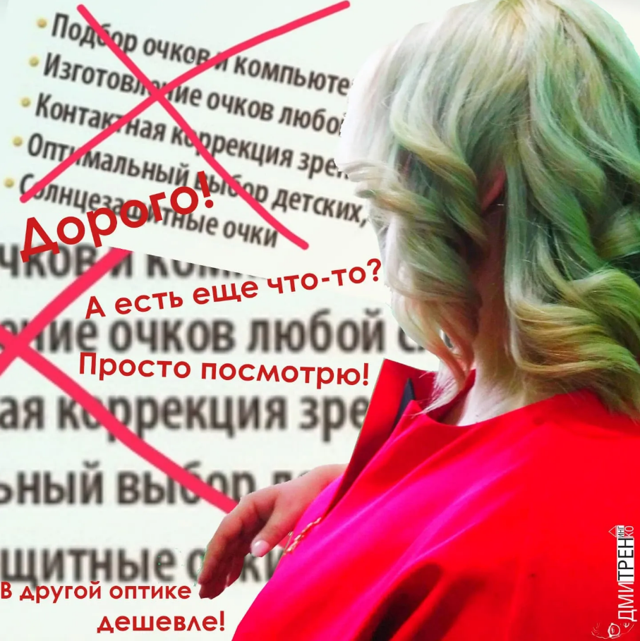 Предлагаю такой необычный ход, который выделит вашу оптику среди других собратьев по бизнесу. Новые смешные услуги Например, обыграйте тему типичных возражений в вашем салоне и сделайте эдакое шутливое объявление в соцсетях или при входе (а почему бы нет?): "В нашем салоне введен новый перечень услуг👍! Теперь вы всегда сможете: Ждем вас в нашей клиентоориентированной оптике!" Как вам такой подход?😉