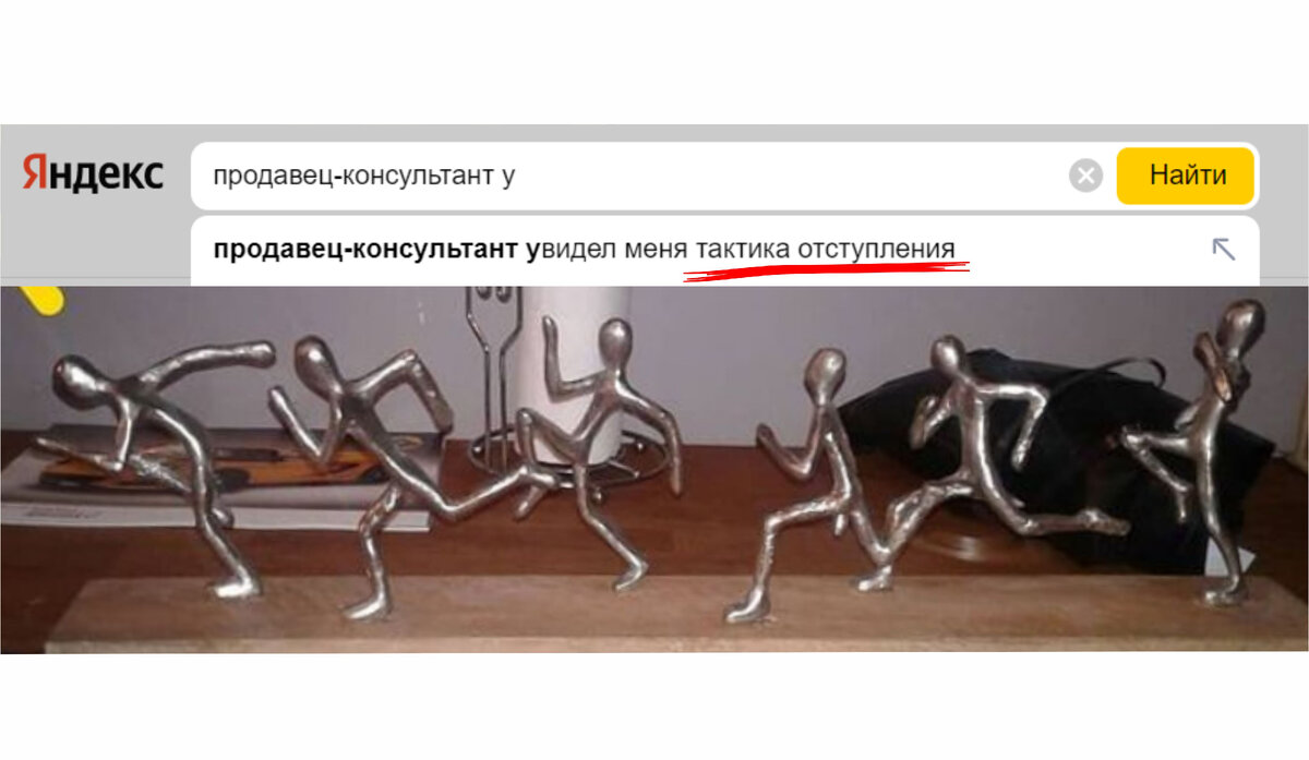 Обнаружил, что интернет выдает по запросу "продавец-консультант у...." такой вариант - "увидел меня тактика отступления". Я подумал, что это гениально. Потому что иногда в магазине не знаешь куда деться, и пока теряешь время на раздумья, продавец-консультант подходит с растянутой улыбкой и спрашивает, чем он может помочь, перекрывая пути к отступлению. Поэтому решил собрать из интернета советы, чтобы в следующий раз быть во всеоружии. Пользуйтесь или предлагайте свои. Прыжки Быстро пропрыгать мимо кассы. (Если консультанта не перепрыгнуть, то валите его) Просто прыгать перед консультантом, может подумает, что вы сумасшедший, и сам свалит. (Но тут есть опасность - если консультант настойчивый, может начать прыгать с вами и пытаться что-то навязать) Живое-неживое-глухонемое Притвориться манекеном. (Но если в магазине вообще нет манекенов, то можно пролететь) Залечь и притвориться мусором. (Но могут позвать уборщицу со шваброй, не знаю, кто страшнее, у нас в школе уборщица всех запугивал
