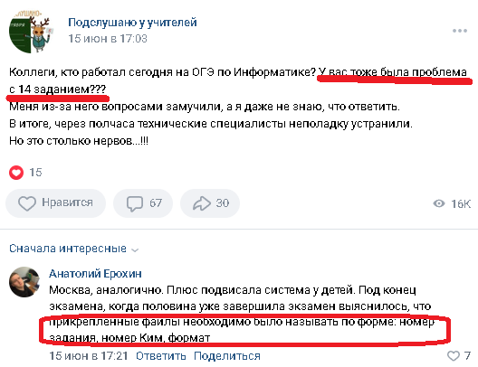 Завтра 22 июня будет проходить опять ОГЭ для выпускников 9 класса по информатике. Как примерно это проходило, я уже написал в своих нескольких статьях, одна из них вот эта: Я решил поискать в пабликах учителей информацию с проблемами на этом экзамене, выяснилось следующее: 1. Была проблема с 14 заданием. Грубо говоря в задании был вопрос про ветер, а таблица практического задания была про любимые предметы. 2. ОГЭ не единый. Именование файлов в разных местах делали по-разному: Где-то в инструкция по бланку ответов №1, а где-то по бланку ответов №2 Люди искренне не понимали что оказывается инструкции были разные в разных регионах. Вот ещё иллюстрация к сказанному. Теперь что касается того как работали техспецы. Да, это не моя проблема, как уже заметил Кастор Иванович, но не высказаться я не могу. Один из коллег уже высказал своё мнение о "подлости" некоторых техспецов. К сожалению и увы это было. То есть ребёнок делал задание №13.2, задание 14, сохранял как положено на рабочем столе, НО