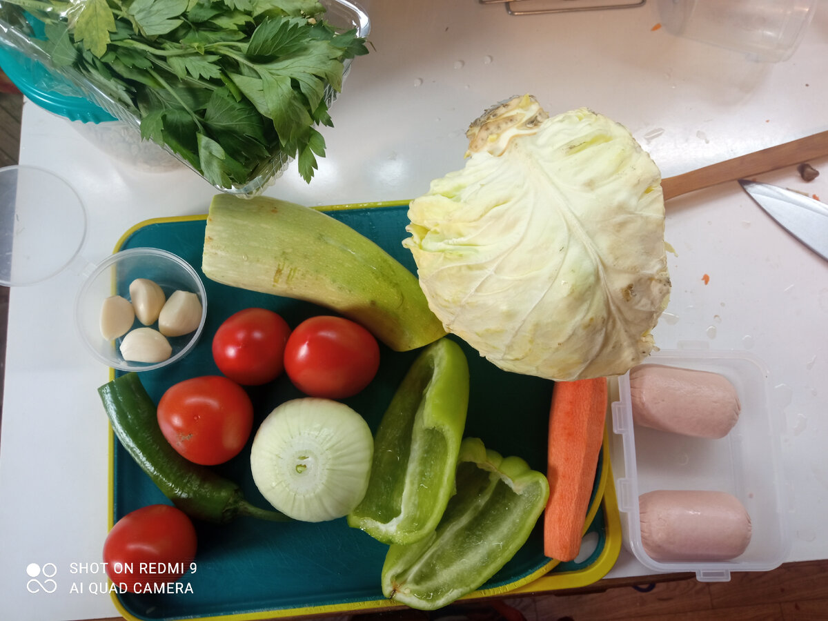 Разбирая холодильник нашла всего по чуть-чуть. Выбрасывать продукты я не люблю. Лучше их в дело. И так. Вот такой продуктовый набор. Первое, мелко порезать 2 зубчика чеснока и в сотейник обжарить. Ставим кипятить воду. А пока трем морковь и нарезаем лук, можно покрупнее. Как только по кухне распространился запах чеснока, кладём морковь и лук. Пока они обжариваются, нарезаем колбасные изделия, затем кладём в сотейник. Дальше нарезаем перчик, в сотейник. Шинкуем капусту, нарезаем кабачок, все в сотейник. Добавляем немного воды, чтобы не пригорело, пока капуста и кабачок не дадут сок. Накрываем крышкой, уменьшаем огонь на минимум и тушим. А пока тушится, в закипевшую воду кладём помидоры. Предварительно сделав небольшой крестообразный надрез. Прям минуту или две, снимаем. Немного остывает, чистим и нарезаем кубиками. И туда же в сотейник. Накрываем крышкой, тушим. Когда все готово, солим, перчим, добавляем специи. Добавляем томатную пасту. Я добавляю немного сахара (1/2 чайной ложки), что