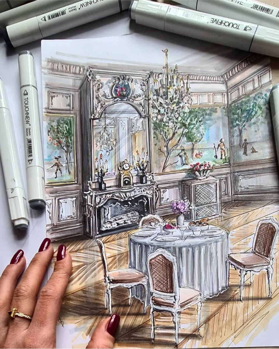Интерьер в стиле барокко, роккоко, да даже в стиле сдержанного классицизма коринфского ордера, требует кропотливой детализации. Получается не просто скетч дизайн-концепции, а полноценная интерьерная картина. Стоимость визуализации классического интерьера от 5000 руб. #скетчинтерьера #дизайнинтерьеров #визуализацияинтерьера #визуализациядизайнпроекта #эскизинтерьера #скетчмаркерами