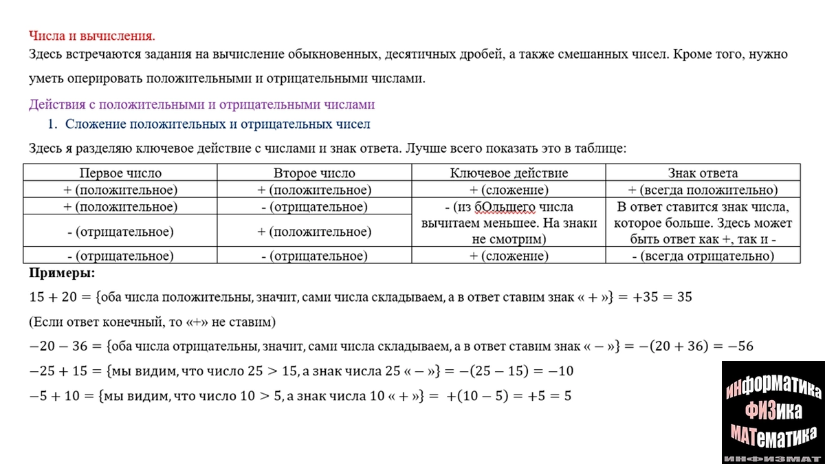 Правила действий с положительными и отрицательными числами изучаются ещё в 6 классе. Однако очень часто встречаются сложности с правильным вычислением таких чисел и у девятиклассников. Для начала рассмотрим правила сложения и вычитания. Я представила эти правила в виде таблицы. Внесу ясность. «Ключевое действие» - это то действие, которое мы по факту будем выполнять с числами не обращая внимание на знак. Либо складывать, либо вычитать. А вот какой знак поставить - указано в столбце «знак ответа». Разобранные примеры также облегчат понимание этой коварной темы. Следующий тип действий - умножение и деление. Правила также представлены в таблице. Ключевого действия в данной таблице нет. Действие с самими числами выполняются в соответствии с заданием - либо делим, либо умножаем. А вот как определить знак ответа - табличка отлично помогает в этом вопросе.