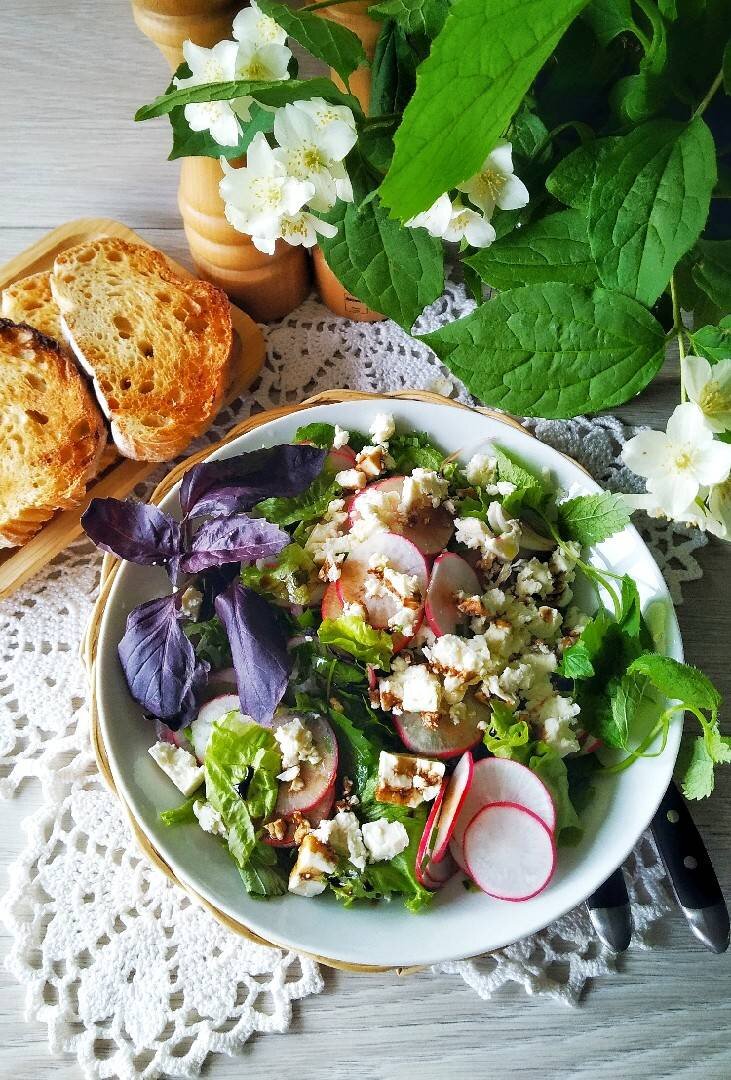 Всем 🌧☀🌧приветик! Хочу поделиться с вами классным рецептом. Такой салатик хорош и сам по себе и в качестве гарнира к мясным/куриным блюдам. Лёгкий, хрустящий и очень полезный. Особенно, если зелень и редиска со своего огорода😊 #салаты #салат #ПП #ППсалат #редиска #редис #сыр #салатлатук #базилик #мята #петрушка #заправка #летнееменю #салатнаязаправка #итальянскаякухня Ингредиенты: редиски, рассольного сыра, салата, петрушки, салатной луковицы, базилика, мяты, Заправка:, оливкового масла, крема бальзамик (или бальзамического уксуса), соль, перец Способ приготовления: Моем в холодной проточной воде зелень и редиску. Обсушиваем. Салатный лук нарезаем тонкими полукольцами и заливаем очень холодной водой на 10 мин. Крупно нарезаем салатные листья или рвём руками. Зелень нарезаем на крупные кусочки. Редиску нарезаем на тонкие кружочки. Сыр измельчаем на небольшие кусочки. Собираем салат. На плоскую тарелку выкладываем листья салата, зелень, лук и редиску. Посыпаем сверху сыром. И поливаем