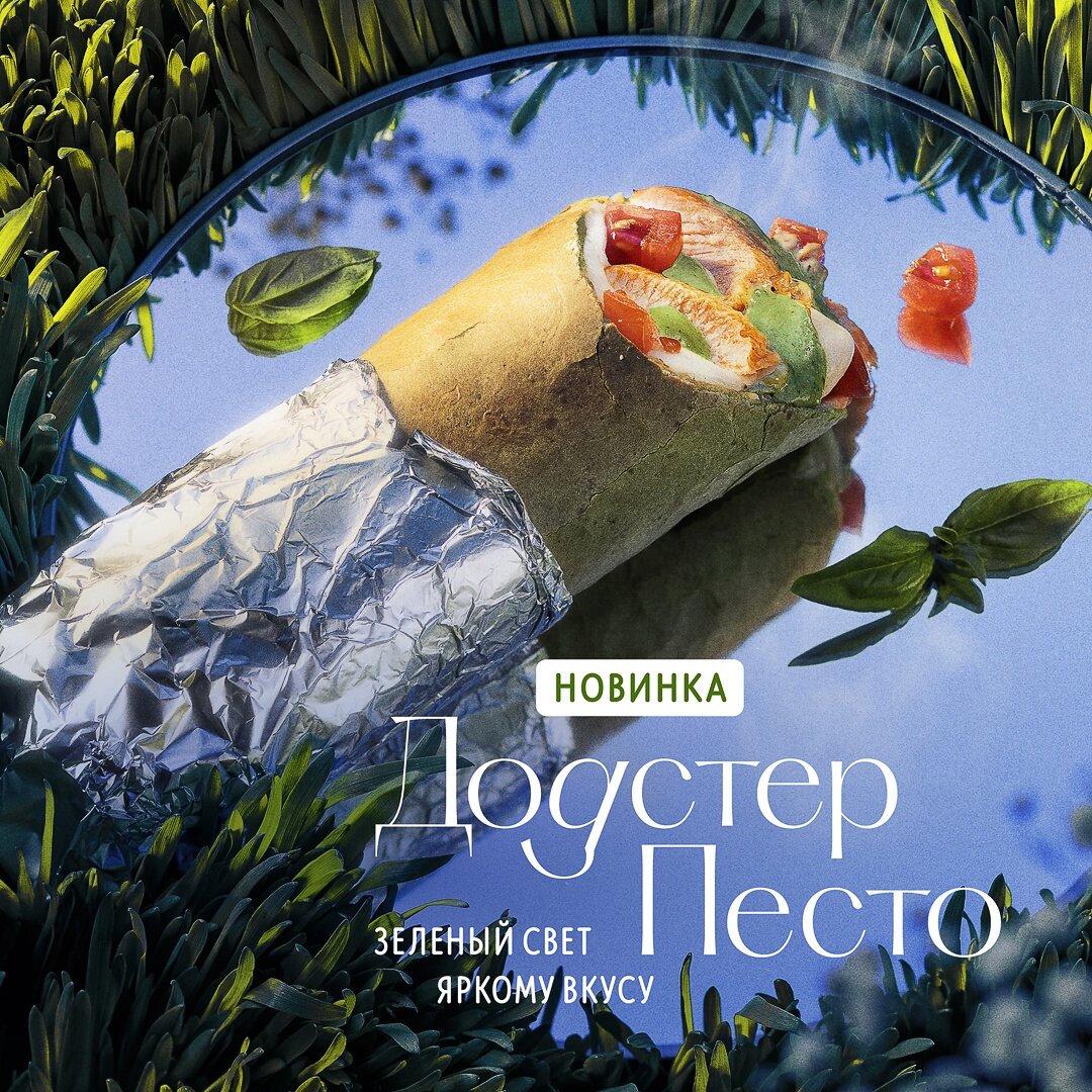 Мы завернули кусочки цыплёнка, свежие томаты, сливочную моцареллу и пряный соус песто в тортилью со шпинатом, чтобы вам было по-летнему вкусно.