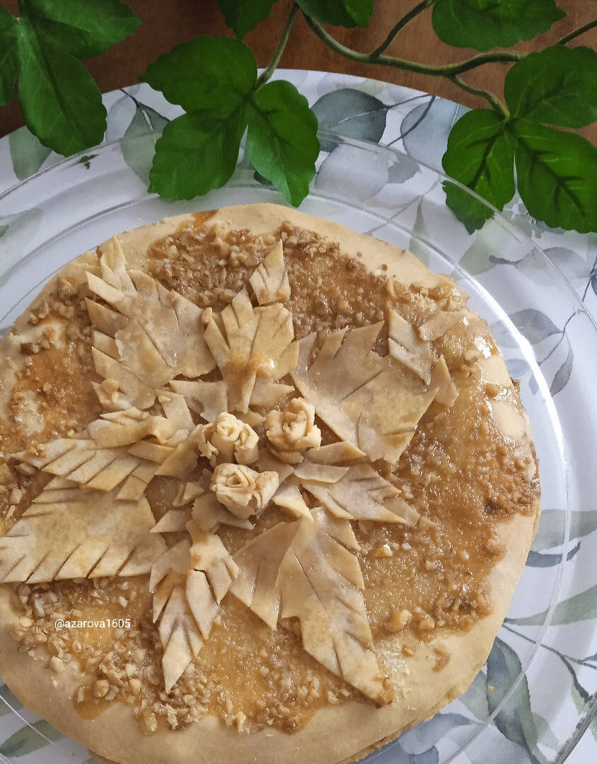 Рецепт придуман на основе рецепта пахлавы. Для любителей чая или кофе с восточными сладостями. Ингредиенты: Тесто:, мягкого сливочного маргарина, сахара, яйцо, сметаны или йогурта, разрыхлителя, муки (+ на подсыпку), Начинка:, грецких орехов, сахара, На пропитку:, густого меда, воды Способ приготовления: В миску положить мягкий маргарин, добавить сахар, размешать, добавить яйцо и сметану, перемешать до однородности, добавить муку с разрыхлителем и замесить мягкое, не липнущее к рукам тесто. Муку добавлять постепенно, так как мука бывает разная. Готовое тесто положить в пакет и отправить в холодильник минут на 20-ть. Затем достать, разделить на четыре части, каждую округлить. Орехи натереть на терке, добавить сахар и перемешать. Кусочек теста тонко раскатать прямо на пищевой пленке или пакете, затем с помощью тарелки вырезать круг и отправить на противень, сверху насыпать орехи с сахаром и равномерно распределить по всей поверхности. Так проделать с каждым кусочком (с помощью пакета тон