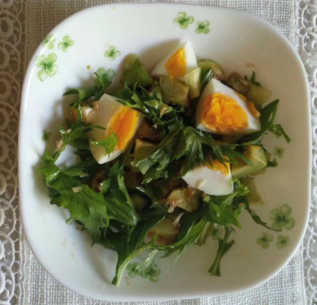 Вкусный овощной салат для лёгкого летнего ужина. #летнееменю Ингредиенты: - руккола, - небольшой огурец, - авокадо, - яйцо, Заправка:, - лимонный сок, - оливковое масло, - соевый соус, - чеснок, - мёд (по желанию) Способ приготовления: Листья рукколы нарвать произвольными кусочками. Огурец очистить от кожуры и нарезать не очень крупно. Авокадо ложечкой отделить от кожуры и также нарезать. Варёное яйцо разрезать на четвертинки. Всё сложить в салатницу и аккуратно перемешать. Для заправки в отдельной посуде смешать лимонный сок, оливковое масло, соевый соус, мёд и пропущенный через пресс чеснок. Если мёд затвердевший, предварительно растопить на водяной бане. Заправить салат.