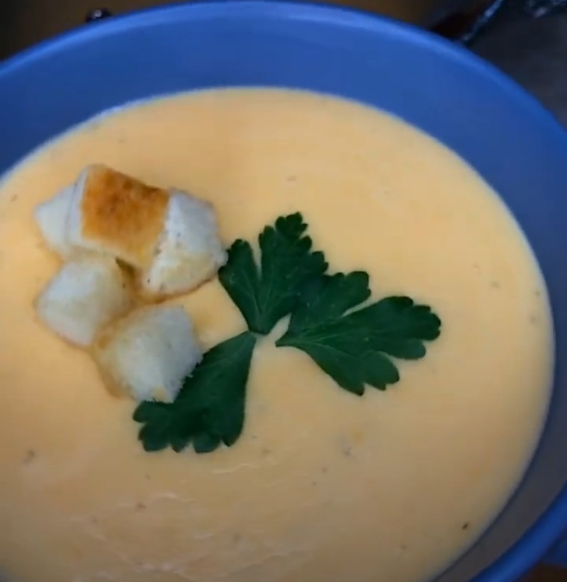 Понадобится: Любой бульон-1 литр Картофель-4 шт Лук-1 шт Морк-1 шт Плавленный сыр-200 гр Сухарики Соль, перец Готовим: Невероятно вкусный,нежный, сырный крем суп из самых доступных ингредиентов. Ставим сковородку разогреваться, наливаем масло. Нарезаем лук не сильно мелко и одну морковку. Обжариваем буквально пару мин и перекладываем в кастрюлю. Берём четыре картофеля,нарезаем, отправляем в кастрюлю и заливаем литром любого бульона. И отвариваем до полной готовности. Багет нарезаем кубиками. Обжариваем на сковородке на сливочном масле,можно добавить два зубчика чеснока и обжариваем буквально пару минут до золотистого цвета. Как только картофель сварился, давляем к нему 200 грамм плавленного сыра. Перемешиваем,добавляем соль и чёрный перец, затем сразу же пробиваем блендером до получения однородной массы. Разливаем по тарелкам и украшаем. Добавляем сухарики и сразу же можно кушать. Быстро, просто и очень вкусно всем приятного аппетита!