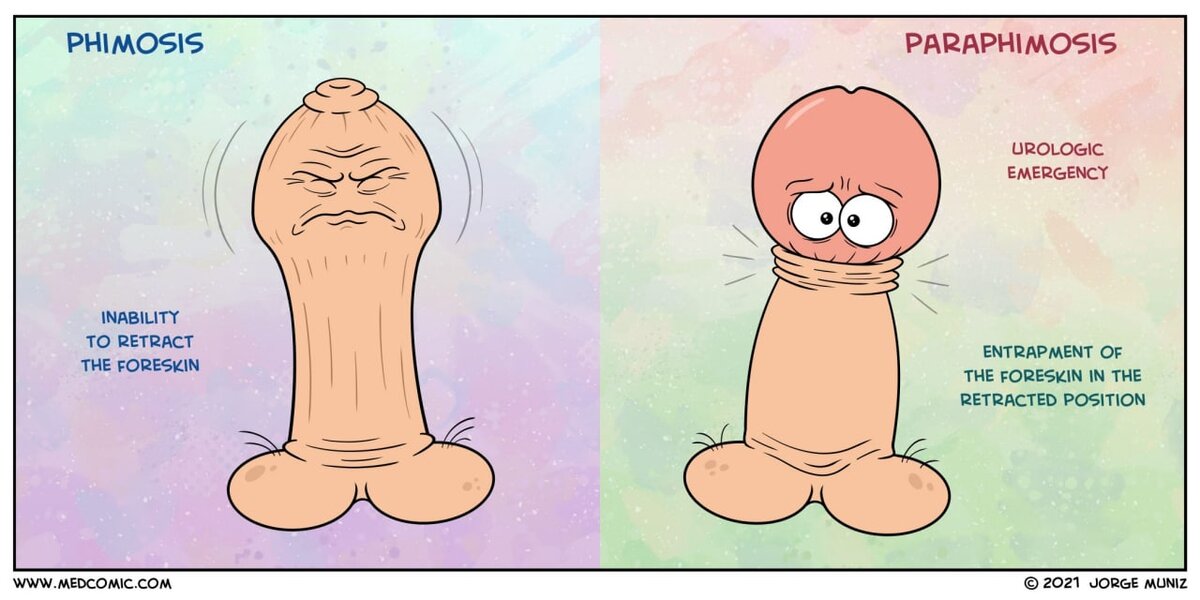 Много раз говорили с вами о том, что такое фимоз. Напомню, фимоз - патологическое состояние, при котором невозможно вывести головку полового члена за пределы крайней плоти. Так вот, парафимоз - это не фимоз у нескольких детей одновременно, как может показаться на первый взгляд. 📌Парафимоз - состояние, когда головку за пределы крайней плоти вывели, а назад закрыть крайнюю плоть не получается. Короче говоря, вывели, а дальше - ой ой ой! Что делать то теперь?🫢 Причин возникновения такой штуки может быть несколько: 1️⃣Баловался - вывел сам, сказать постеснялся. 2️⃣Баловался и вывел сам, сказать не смог, потому что маленький и говорить не умеет 3️⃣Вывели во время воспаления, чтобы промыть антисептиком 4️⃣Вывела девочка во время петтинга (надеюсь все знают, что это за зверь) 5️⃣Писал или мылся - вывел и забыл убрать назад (да да, так бывает) 6️⃣Мама или папа мыли и дальше все то же самое 7️⃣Травма. Например, пирсинг или какие-то медицинские манипуляции с последующим отеком 8️⃣Описаны случа