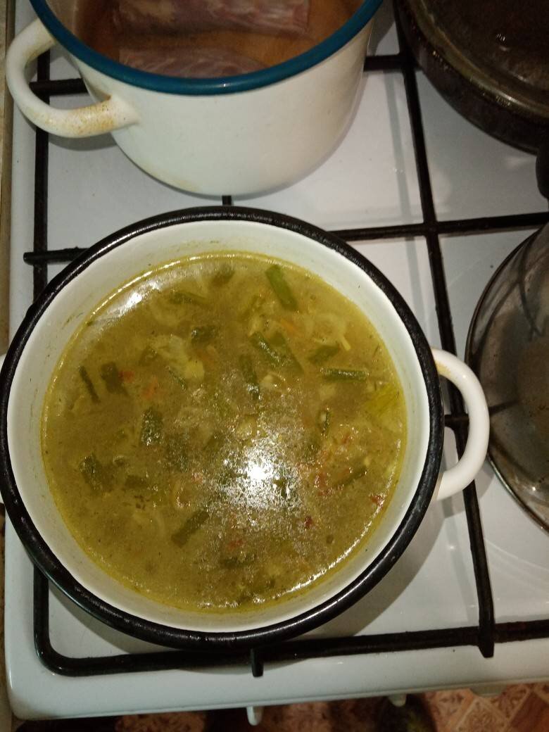 Остались с прошлого года опята, а маринованные грибы и я как-то не нашли общий язык, но в супе вкусно и готовится за 25 минут максимум. Делала 2 раза, в деревне и в городе с разницей, что один раз добавила в суп зубчик чеснока, а зажарку делала на растительном вместо топленого, а сливочное масло просто добавила в суп за 5 минут до готовности. Ингредиенты: воды, луковицы, морковки, небольших картофелины, маринованных грибов, топленого сливочного масла, соли, Укроп, Смесь петрушки (зелень и корни), Лук зелёный Способ приготовления: Картошку очистить, помыть и порезать. В кастрюлю налить воды, засыпать картошку и поставить варить. Порезать лук и морковь (была уже порезана и заморожена), на сковородке растопить топлёное масло, добавить лук и обжарить, добавить морковь и ещё пожарить. Зажарку влить в кастрюлю к картошке и варить минут 5, добавить смесь петрушки (зелень и корни с солью), варить минут 5. Порезать маринованные грибы и зелёный лук, добавить в кастрюлю и варить минут 5. Порезать