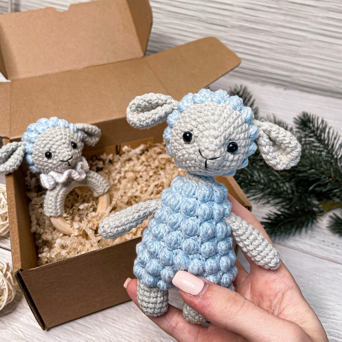 Голова (серым цветом): 1. 6 сбн. в КА (6) 2. (1 сбн., пр.) х 3(9) 3. (2 сбн., пр.) х 3 (12) 4. (1 сбн., пр.) х 6 (18) 5. (2 сбн., пр.) х 6 (24) 6. (3 сбн., пр.) х 6 (30) 7-9. 30 сбн. (3 ряда) Сменить цвет пряжи на голубой. 10. (1 «попкорн», 1 сбн.) х 15 (30) 11. 30 сбн. (1 ряд) 12. (1 «попкорн», 1 сбн.) х 15 (30) 13. (3 сбн., уб.) х 6 (24) Вставить глазки 6 мм между 5 и 6 рядами на расстоянии 8 сбн. 14. (1 «попкорн», 1 сбн.) х 12 (24) 15. (2 сбн., уб.) х 6 (18) 16. (1 «попкорн», 1 сбн.) х 9 (18) 17. (1 сбн., уб.) х 6 (12) 18. (1 «попкорн», 1 сбн.) х 6 (12) 19. 6 уб. Стянуть отверстие, нить обрезать, закрепить. ⠀ Воротничок (белым цветом): Набрать 15 в.п. + 2 в.п. подъема 1. (3 ссн. в 1 петлю) х 15 (45) 2. (2 сбн. в 1 петлю) х 45 (90) ⠀ Ушки (серым цветом): 1. 6 сбн. в КА (6) 2. 6 пр. (12) 3. (1 сбн., пр.) х 6 (18) 4-7. 18 сбн. (4 ряда) 8. (1 сбн., уб.) х 6 (12) Сложить пополам, провязать 6 сбн. Оставить длинный кончик для пришивания. ⠀ Ручки (серым цветом): 1. 6 сбн. в КА (6) 2. (1 сб