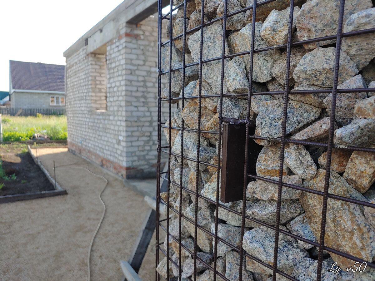 Приветствую зрителей и читателей своего канала. Сегодня хотел поделиться вот такой вот интересной мыслью в заборостроении, которую смог реализовать мой сосед. Может быть на фотографии эти колонны смотрятся не так эффективно,но в реальном исполнении, они не просто красиво выглядят,а заставляют смотреть с интересом. Изначально я и представить не мог, для чего мой сосед начал обваривать столбы кладочной сеткой. А говорить он не хотел))). Моя же версия была такой, что потом, в эту сетку, он как-то будет помещать растения. А когда он начал засыпать камни, то всё стало понятно и ещё интереснее. Вид колонн и горизонтально лежачих препятствий, сильно и интригующе, заставлял всех прохожих смотреть, не отрывая глаз. Но сосед упорно продолжал засыпать камни, не отвлекаясь на прохожих и их постоянные вопросы. Ему понадобилось три дня, чтобы такая красота стала радовать взор. Конечно же задаётся один и тот же вопрос, про его долговечность, или лучше сказать про крепость сетки и сколько весят эти к