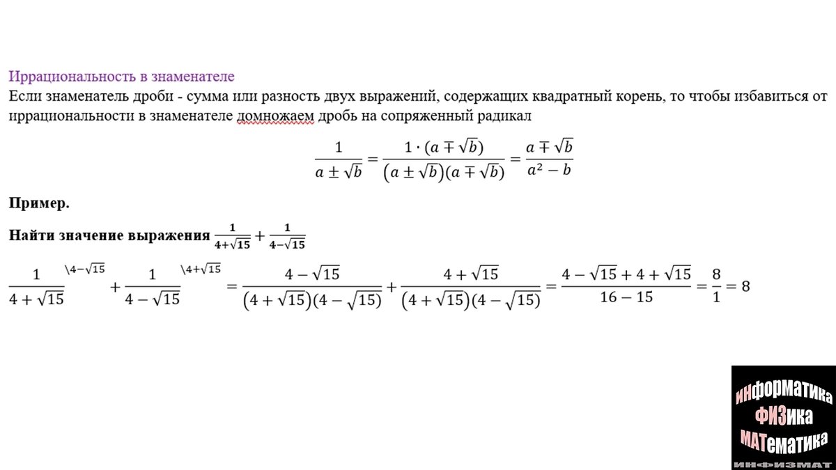 Главная идея метода - собрать ФСУ разность квадратов в знаменателе. Тогда, при возведении в квадрат каждого слагаемого, корень уходит.