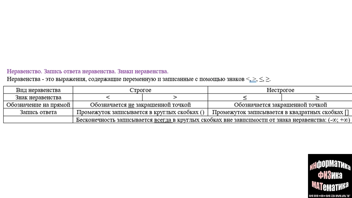 Существуют строгие и нестрогие неравенства. Для каждого вида существуют свои знаки и способы как графического изображения, так и алгебраической записи. А ещё и бесконечность надо как-то записать. Предлагаю удобную табличку, по которой легко можно определить и вид галочки, и вид точечки, и как записать ответ.