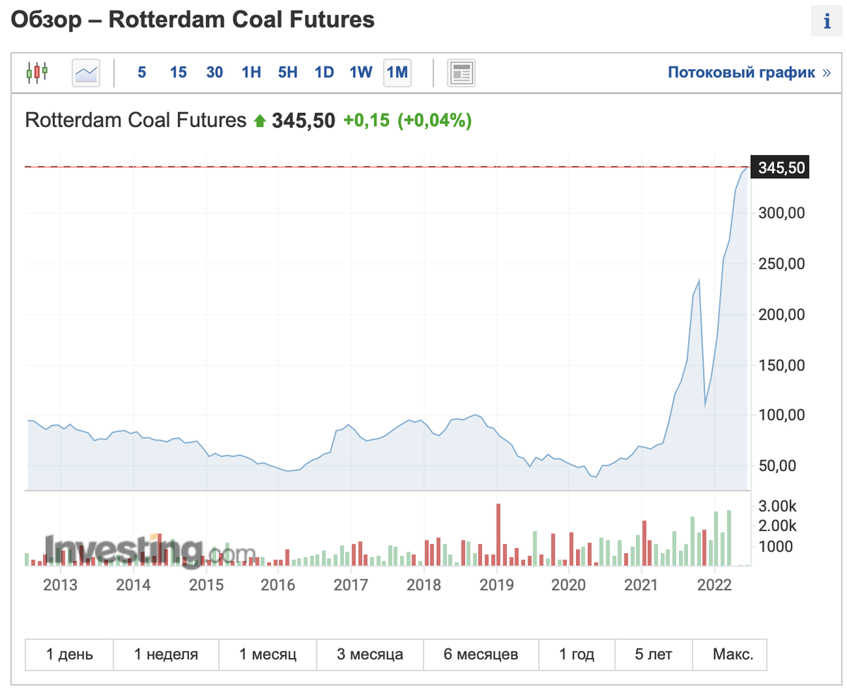 В текущей ситуации цена на уголь в ЕС вполне может подняться до $400 за тонну уже к июлю, так как санкционная политика ЕС загоняет цены на газ на уровни $1200–1500 за 1000 куб. м. Но приближение зимы может заставить ЕС смягчить ограничения и сдвинуть срок отказа от российского угля. В этом случае к концу года цена вряд ли будет выше $200–250 за тонну"