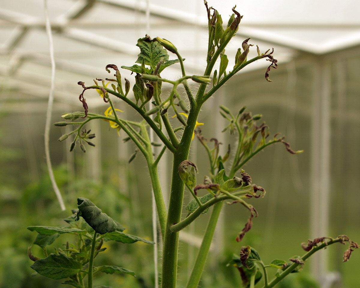 В июле уделите максимум внимания томатам, ведь они могут заразиться таким заболеваниями, как Столбур и Стрик. Не стоит игнорировать и другие овощные культуры, так как температура почвы оказывает большое влияние на все процессы жизнедеятельности овощей. Столбур томатов — заразная болезнь вирусного происхождения. При заражении верхушки томатов розовеют, фиолетовые листья складываются вдоль главной жилки, а цветки усыхают и плоды становятся деревянистыми. Это вирусное заболевание переносят тли и цикадки, а резерватор их — вьюнок полевой и сорные растения. Чтобы предотвратить заражение проводите опрыскивание томатов от тлей и цикадок одним из перечисленных разрешенных препаратов: «Биокилл», «Биотлин», «Фуфанон», «Алиот», «Батрайдер», «Кинмикс» или «Танрек» от тли. Столбур томатов. Главные отличия от стрика Стрик — наиболее вредоносное заболевание томатов, его симптомы легко распознаются по внешнему виду томатного растения: • на стеблях, черешках, плодоножках образуются поверхностные
