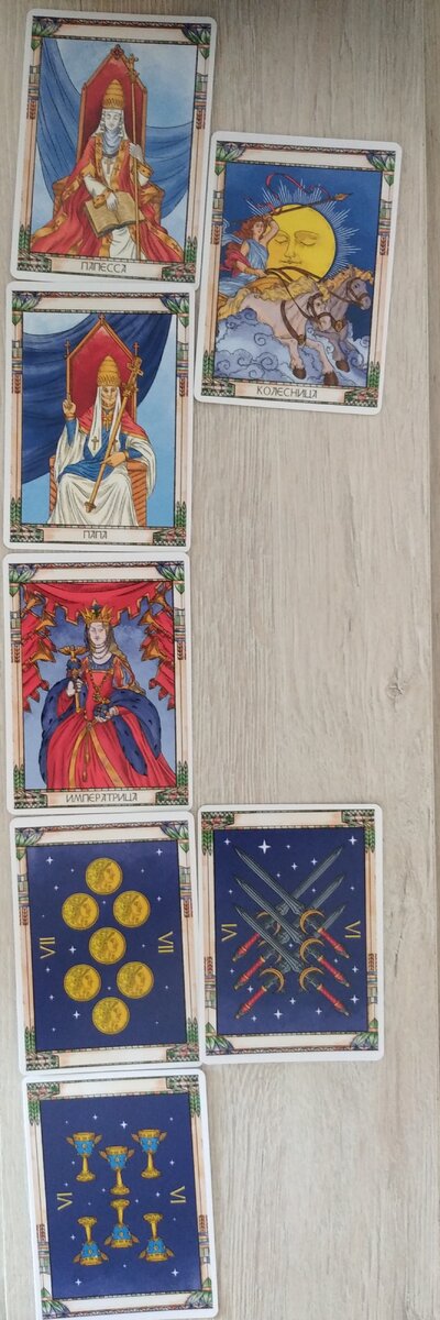 Ситуация на сегодняшний день. Папесса. Карта знаний и интуиции, говорит о стремлении человека знать больше и докопаться до истины. Требует рассудительности в ситуации, предупреждает, что не стоит вмешиваться в происходящее. В перевёрнутом виде указывает на недостаточность информации, нехватку знаний, означает неизвестность или обман. В любовном раскладе карта говорит о том, что человек хочет больше о вас узнать, вы ему интересны, но он не испытывает сильных чувств. Что может помочь. Колесница. Карта успеха и испытаний. Несмотря на жизненные трудности, в силу своей целеустремлённости и уверенности вы преодолеете даже самые сложные препятствия и перейдёте на новый этап вашей жизни. В перевёрнутом виде означает неизбежность перемен, которые кардинально изменят жизнь. В любовном раскладе карта говорит о том, что человек вас сильно любит, не боясь препятствий, стремится добиться вашей любви и быть вместе. К чему может привести. Императрица. Очень благоприятная карта, которая даёт по