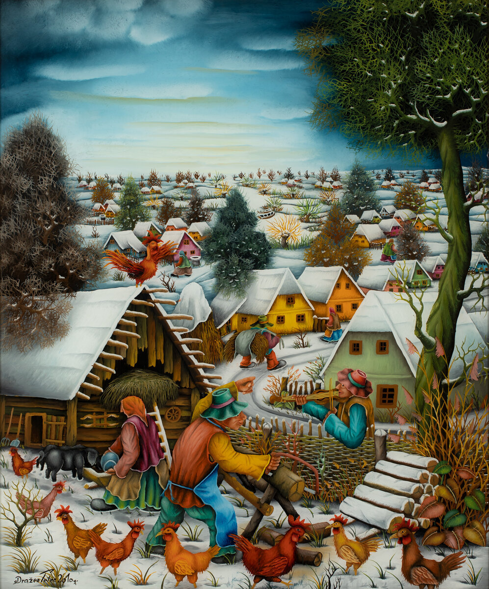 Дражен Тетец «Деревенские заботы», 2010, стекло, масло. 60х50. Картина поступила в дар от коллекционера Владимира Тёмкина (г. Нерехта). Дражен Тетец (1972 г.р.) живет в Хлебине, занимается пчеловодством и каждый день по несколько часов рисует – признается, что без этого никак не может, желание творить идет изнутри. Первые работы Д.Тетец писал еще в детстве, когда по его признанию «ребенком ходил в Хлебинскую галерею как в храм – смотреть и вдохновляться». Хлебине – село на севере Хорватии в долине реки Драва (отсюда название местности – Подравина), известное своими художниками – представителями крестьянской подстекольной живописи. Художники Хлебинской школы работали преимущественно в технике росписи по стеклу, состоящей в нанесении краски на обратную сторону стекла. Картина пишется послойно – от мелких деталей к фону. Патрарх школы Иван Генералич в своих работах выстраивал три плана (герои, пейзаж, фон), и большинство учеников и последователей придерживалось этой формулы. Трёхплановост