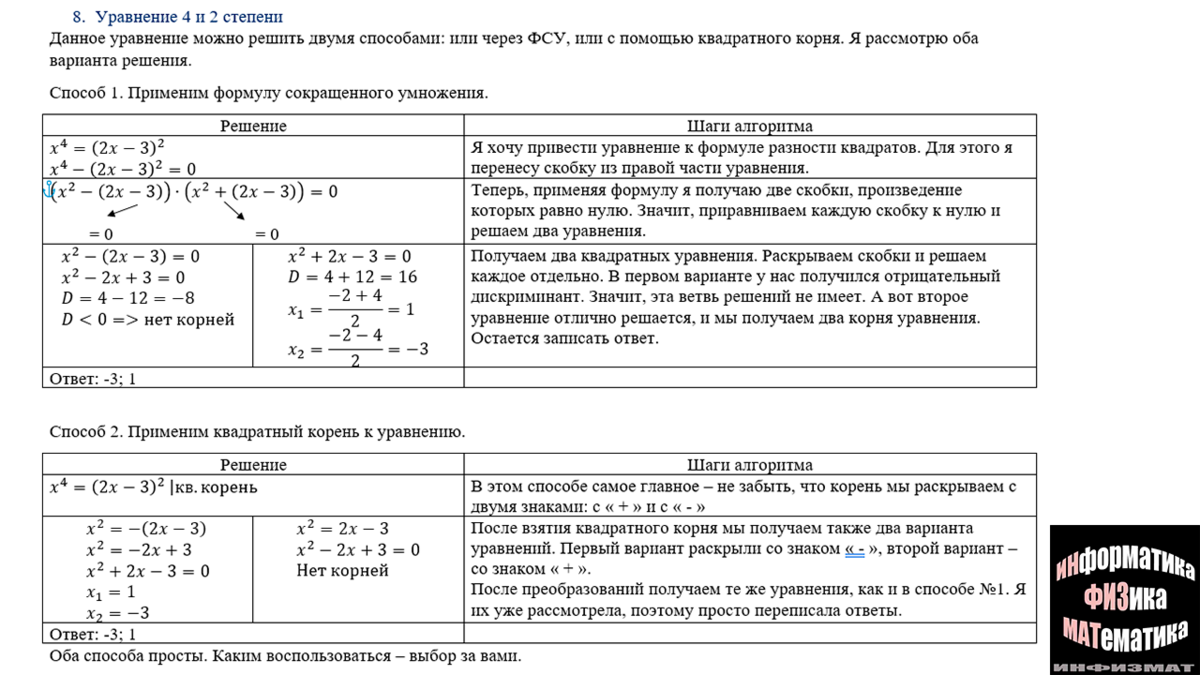 Разбор уравнения с 4 и 2 степенью из №20 второй части ОГЭ по математике. Рассмотрим два способа решения
