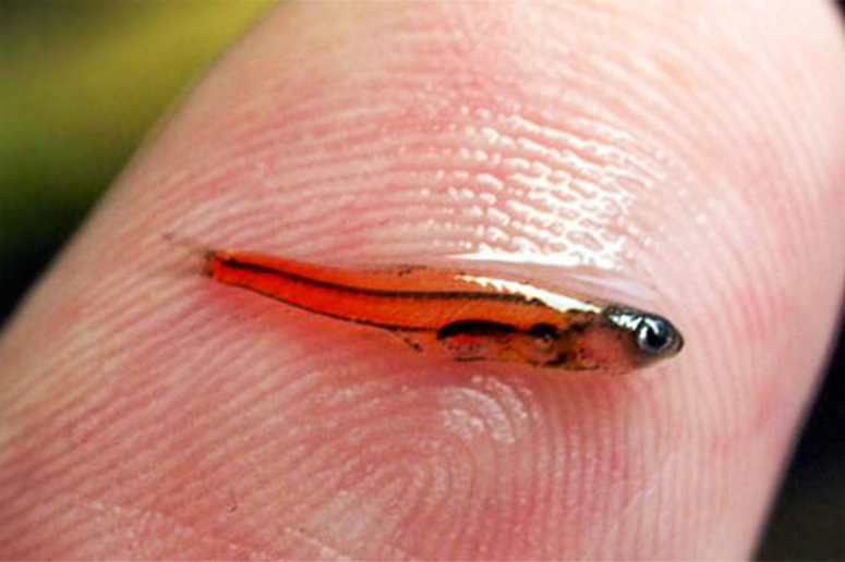 Слоны, киты, жирафы, бегемоты и многие другие являются большими животными, но давайте не будем забывать о маленьких. Карп Паедоциприс Самая маленькая рыбка на свете это Карп Паедоциприс. Обнаружен данный вид был в далёком 2006 году в болотах Суматры(Суматра-остров близ Индонезии). Научное имя этой рыбки Paedocypris progenetica. Взрослая особь этой рыбки достигает всего 8 мм. Карп имеет прозрачный череп и оттого видно его мозг. Питается планктонами и находится под угрозой вымирания из-за исчезновения болотных угодий Индонезии для плантаций пальмового масла. Свиноносая летучая мышь Свиноносая летучая мышь на нынешний день является самой маленькой представительницой рода рукокрылых. Длина этой малышки около 3 см, вес не больше 2 граммов, размах крыльев может достигать 15 см. Свиноносая летучая мышь обитает в основном в карстовых пещерах Таиланда. Как и все летучие мыши Свиноносая ночью охотиться, а днём спит.