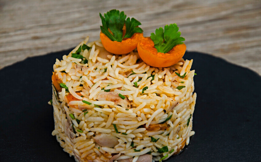 Чтобы придать рису аккуратный желтый цвет, в процессе варки на кончик ножа можно добавить либо немного шафрана, либо измельченную куркуму. ИНГРЕДИЕНТЫ Подготовка Шаг №1 Филе нарезать тонкими полосками. Лук и чеснок режем на маленькие кусочки. Сосиски нарезать ломтиками. Перец очистить и нарезать кусочками. Шаг №2 Нагрейте 2 ст. л. оливкового масла в большой сковородке и обжарить куриные полоски порциями, а также лук и чеснок. Снимите с плиты. Шаг №3 В сковороду вливаем оставшееся подсолнечное масло, всыпаем рис и обжариваем. Добавьте вино и доведите до кипения, затем добавьте бульон и варите на медленном огне около 20 минут. Снимите со сковороды и дайте остыть. Шаг №4 Выложите ломтики колбасы на противень, застеленный пергаментной бумагой, и поставьте в разогретую до 225 градусов духовку на 3-4 минуты. Шаг №5 В большой миске смешайте перец с луком, петрушкой, лимонным соком и оливковым маслом. Посолите и поперчите. Добавьте рис, колбасу и полоски филе с луком и чесноком. Сервируем и п