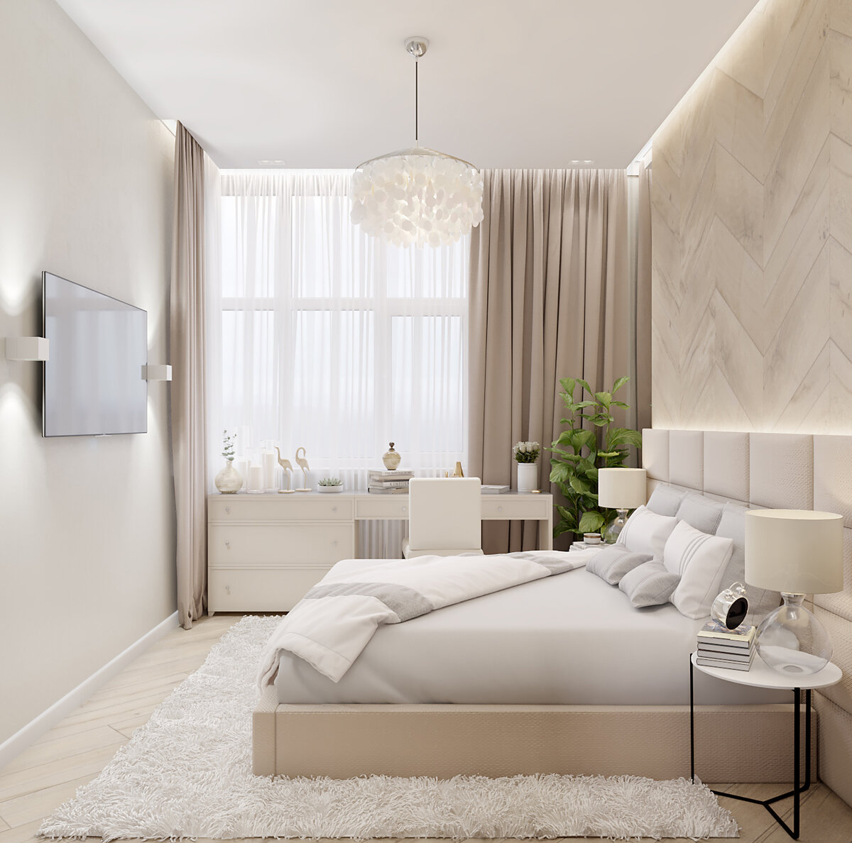 Эту спальню несколько заказчиков просили повторить в своих интерьерах. Интерьер этой спальни даже побеждал в интерьерном конкурсе - правда, уже много времени прошло, но если найду ссылку, обязательно вставлю. Что же так привлекает заказчиков? Ответ примерно сформулирован так: атмосфера, много воздуха, свет. Наличие гардеробной - большой плюс именно такой планировки. Эта спальня выглядит так В #изголовье кровати - #обои и большая мягкая спинка в ткани. Мягкий пушистый #ковер , огромное окно. Вместительный #гардероб - за большой зеркальной дверью. И вот еще одна спальня, дизайн которой который был вдохновлен, собственно, первым интерьером. Планировку мы повторили один-в-один, за исключением туалетного столика. А расположение кровати и гардеробной сохранили. Получилось так: Здесь была задача не просто повторить, но также сократить бюджет реализации. Поэтому декор, мебель и часть светильников подбирали в #икеа , а также заменили изголовье кровати. В изголовье будут стеновые панели