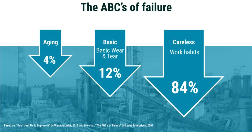 В своей статье "Устранение дефектов, почему без этого не обойтись" её автор Erik Hupje приводит интересную статистику Уинстона Ледета (Winston Ledet) по источникам дефектов (см. иллюстрацию). При этом под дефектами понимаются любые проблемы, связанные с конструкцией оборудования, его установкой, качеством изготовления, соблюдением правил эксплуатации и т.д. Обширные исследования Уинстона Ледета, выполненные за время его работы в Dupont, подтверждают, что дефекты являются основной причиной отказов. Он также даёт следующую классификацию источников дефектов оборудования (ABC): А - старение, которое обычно приводит к возникновению около 4% дефектов, и которые в конечном итоге становятся отказами в течение длительного периода времени (25-50 лет). Эти дефекты возникают, даже если оборудование вообще не эксплуатируется. Их легче всего увидеть в несущих конструкциях и инфраструктуре вашего предприятия (например, в таких материалах, как сталь и бетон). B - фундаментальный износ оборудования во